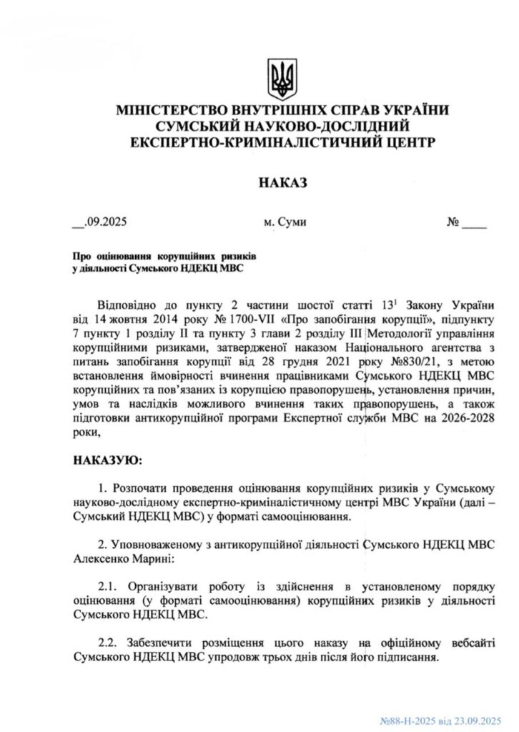 Відповідно до наказу директора Сумського НДЕКЦ МВС від 23.09.2025 року №88-Н-2025 розпочато процедуру оцінювання корупційних ризиків у діяльності Сумського НДЕКЦ МВС. У зв’язку із цим планується створення робочої групи з оцінювання корупційних ризиків та долучення до її складу представників громадськості.